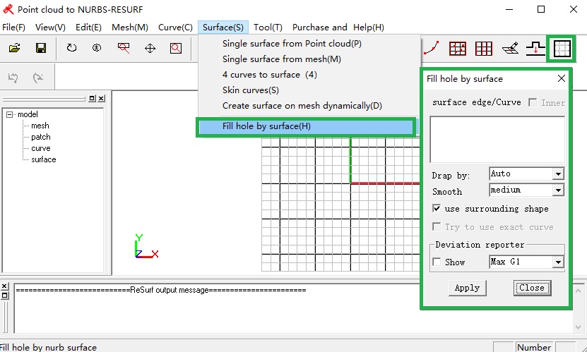 Step 4: Set the parameters . Call RsFillHoleByNurbs_SetDrapSurfaceType() to set the shape type of the surface;