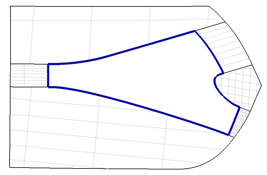 (蓝色曲线内为用非裁剪曲面填充孔洞) 5 ---- 固定四条边界线拉伸,生成第一类孔斯 (coons) 非裁剪曲面 . 程序自动计算 4 个角点。